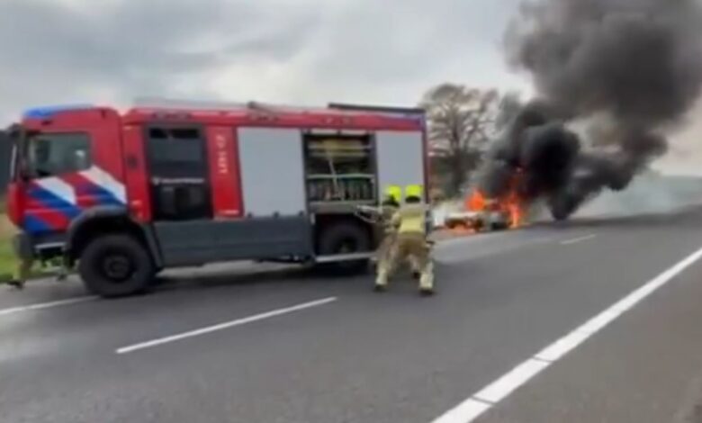 Vlammen slaan uit auto op snelweg; 45 minuten file