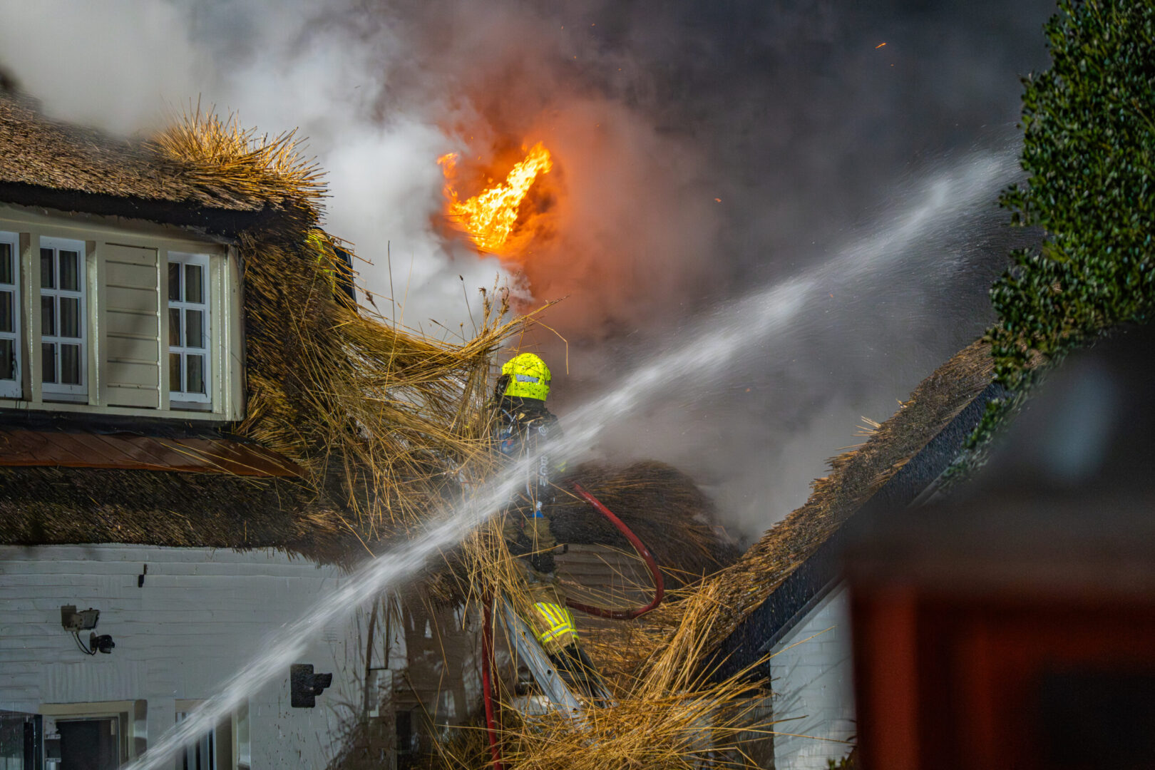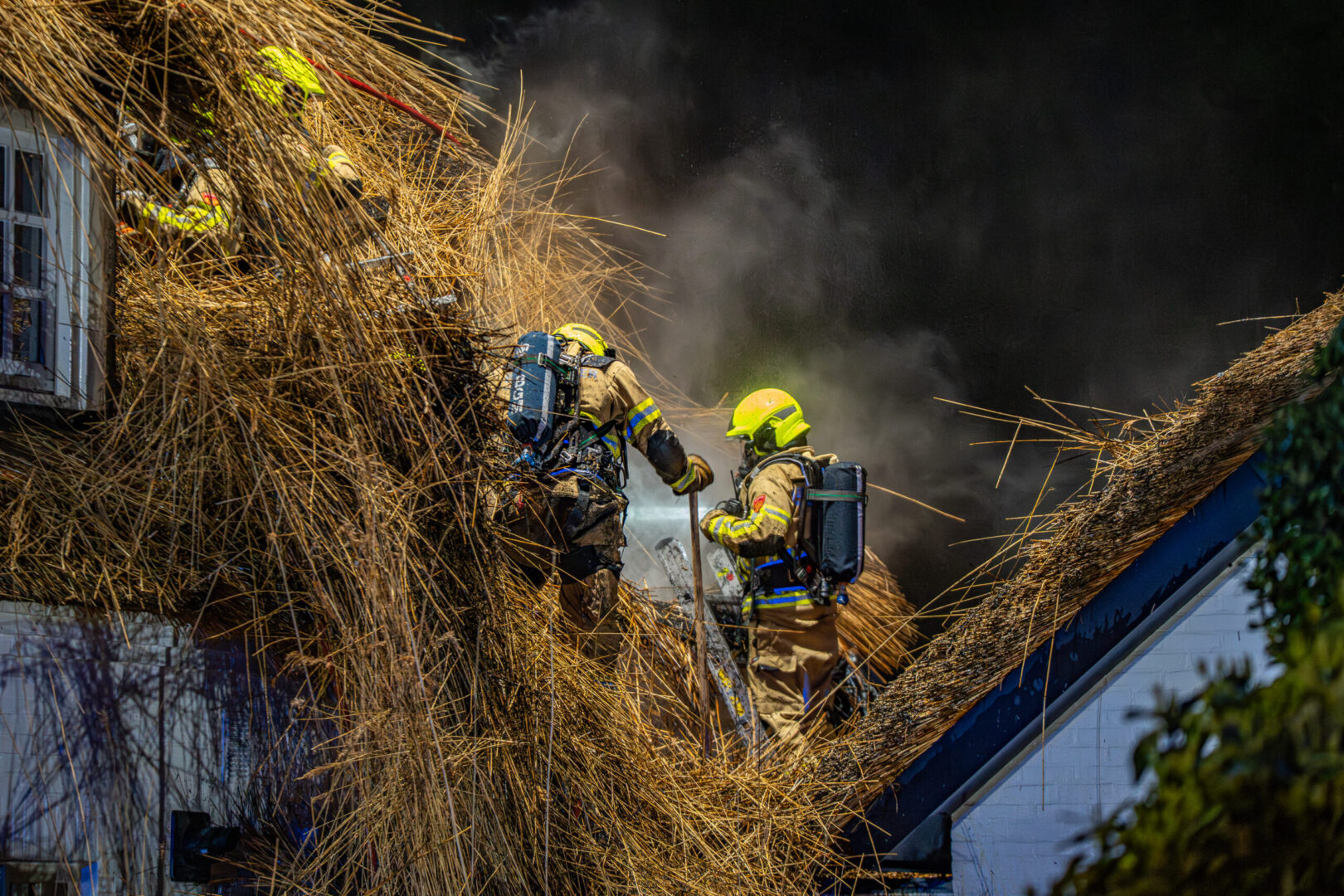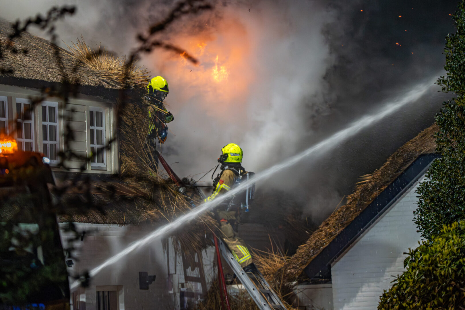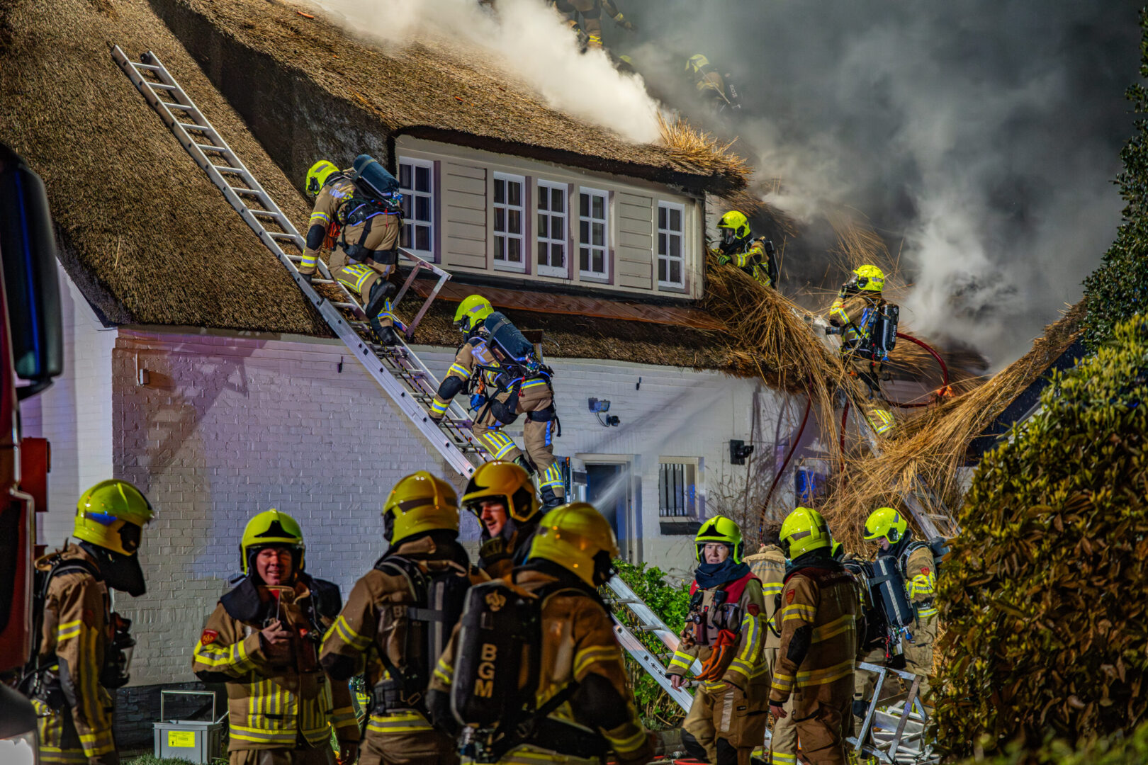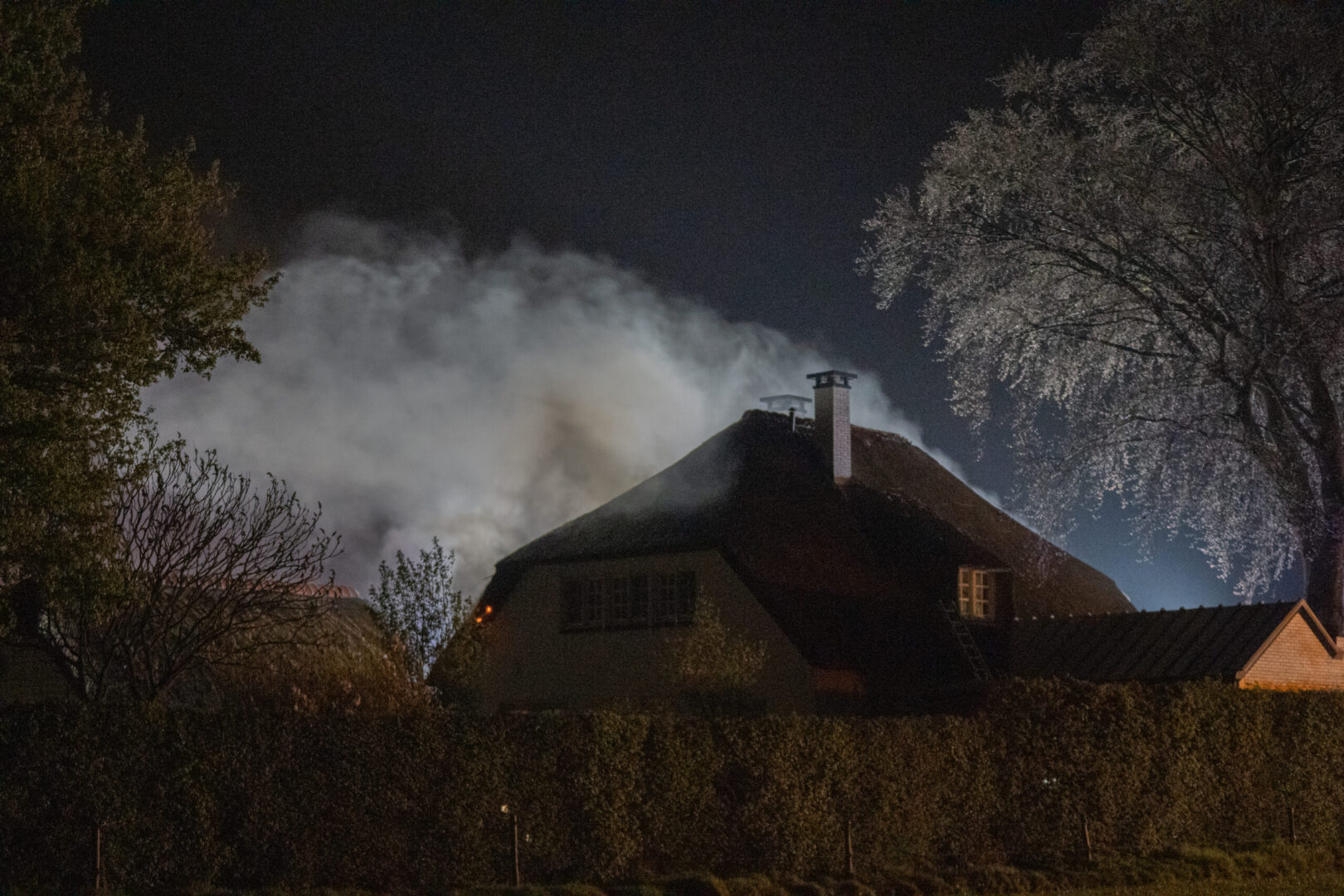 Rond 23.15 uur sloeg mogelijk de bliksem in het dak, waarna al snel brand uitbrak in het dak van het huis. De bewoners konden de woning op tijd verlaten en bleven ongedeerd. Hulpdiensten schaalden direct op vanwege het risico dat een rieten kap snel vlam vat. Brandweereenheden uit de regio kwamen met spoed ter plaatse, waaronder een hoogwerker en een gespecialiseerd team voor rietbranden.