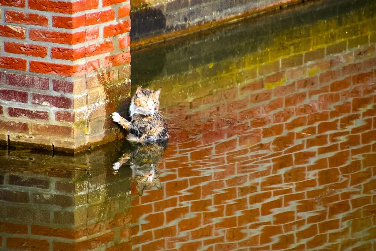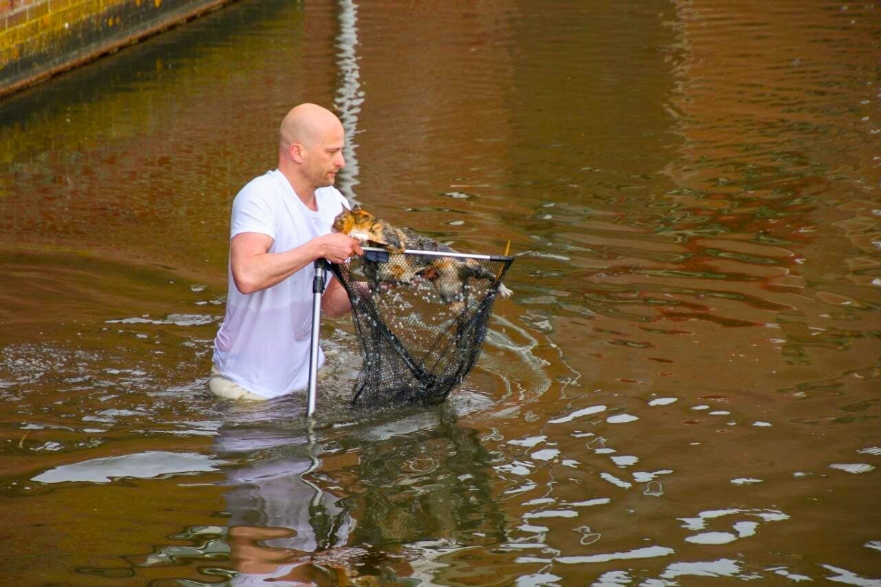 De kat werd rond kwart voor elf in het water aangetroffen. Omdat het dier er zelf niet meer uit kon komen, werd de brandweer gealarmeerd. In afwachting van de hulpdiensten besloot een omstander direct in te grijpen. Hij ging het water in en wist de kat met een visnet te vangen.