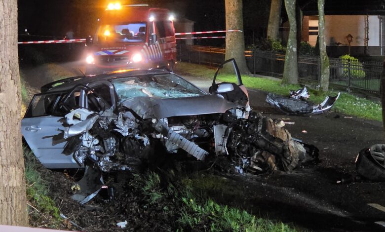 Van de auto is na de crash weinig meer over. De Vijfsprongweg werd tijdelijk afgesloten om hulpverlening mogelijk te maken en onderzoek te doen naar de oorzaak van het ongeval.
