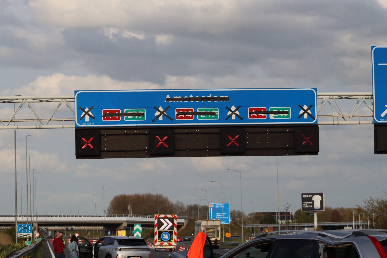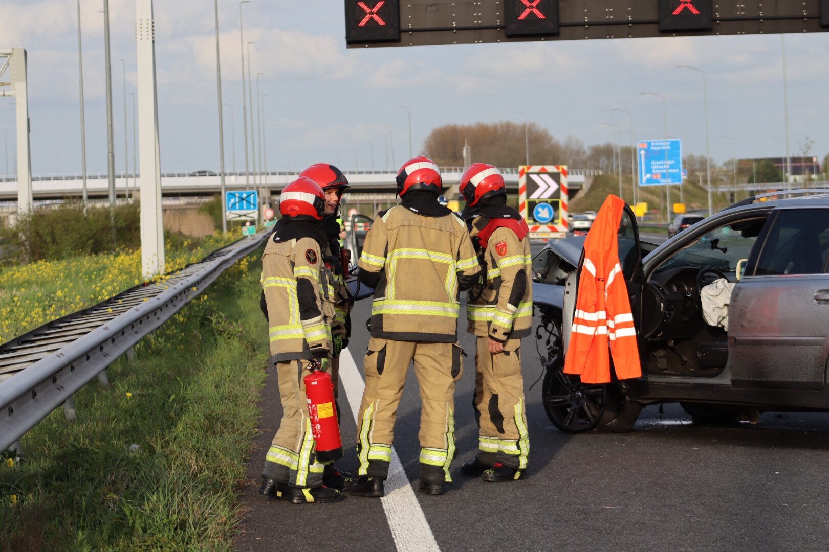 Op het traject staan vanwege werkzaamheden pijlwagens die het verkeer richting een andere rijbaan leiden. Een automobilist merkte deze situatie te laat op en botste tegen een pijlwagen. De auto kwam vervolgens midden op de weg tot stilstand.