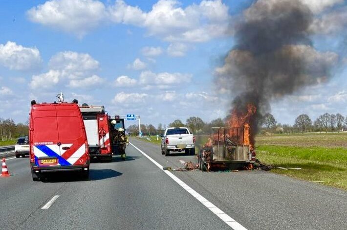 Vlammen slaan uit aanhanger op snelweg