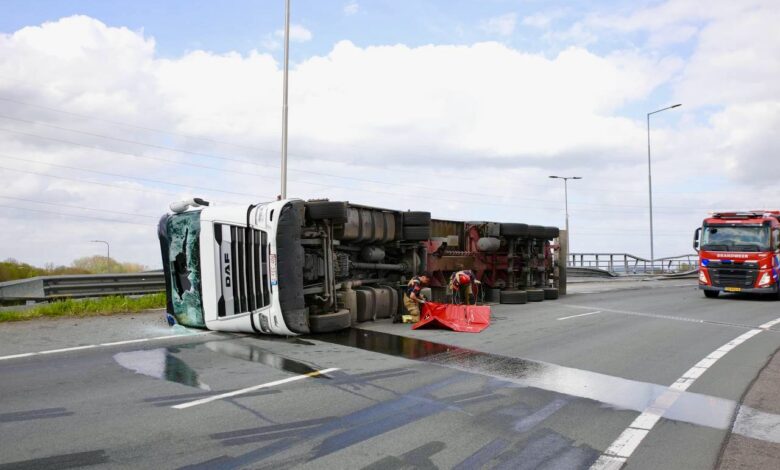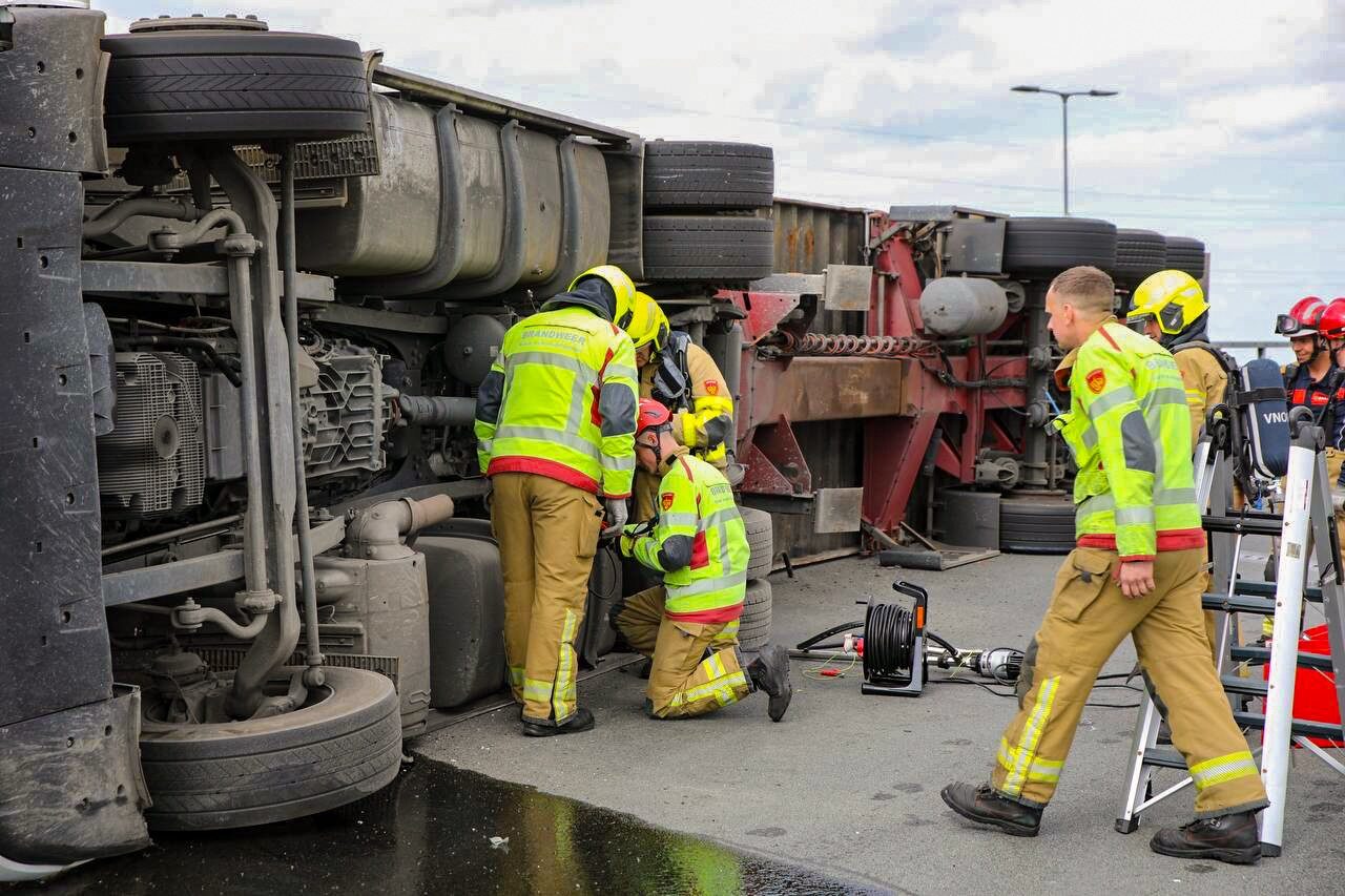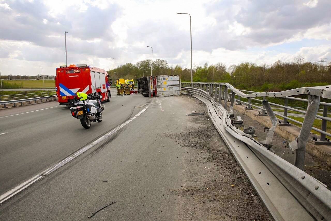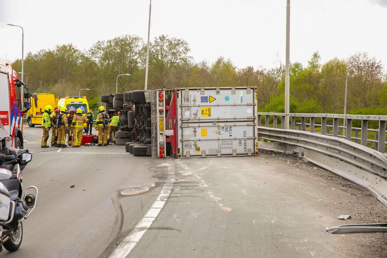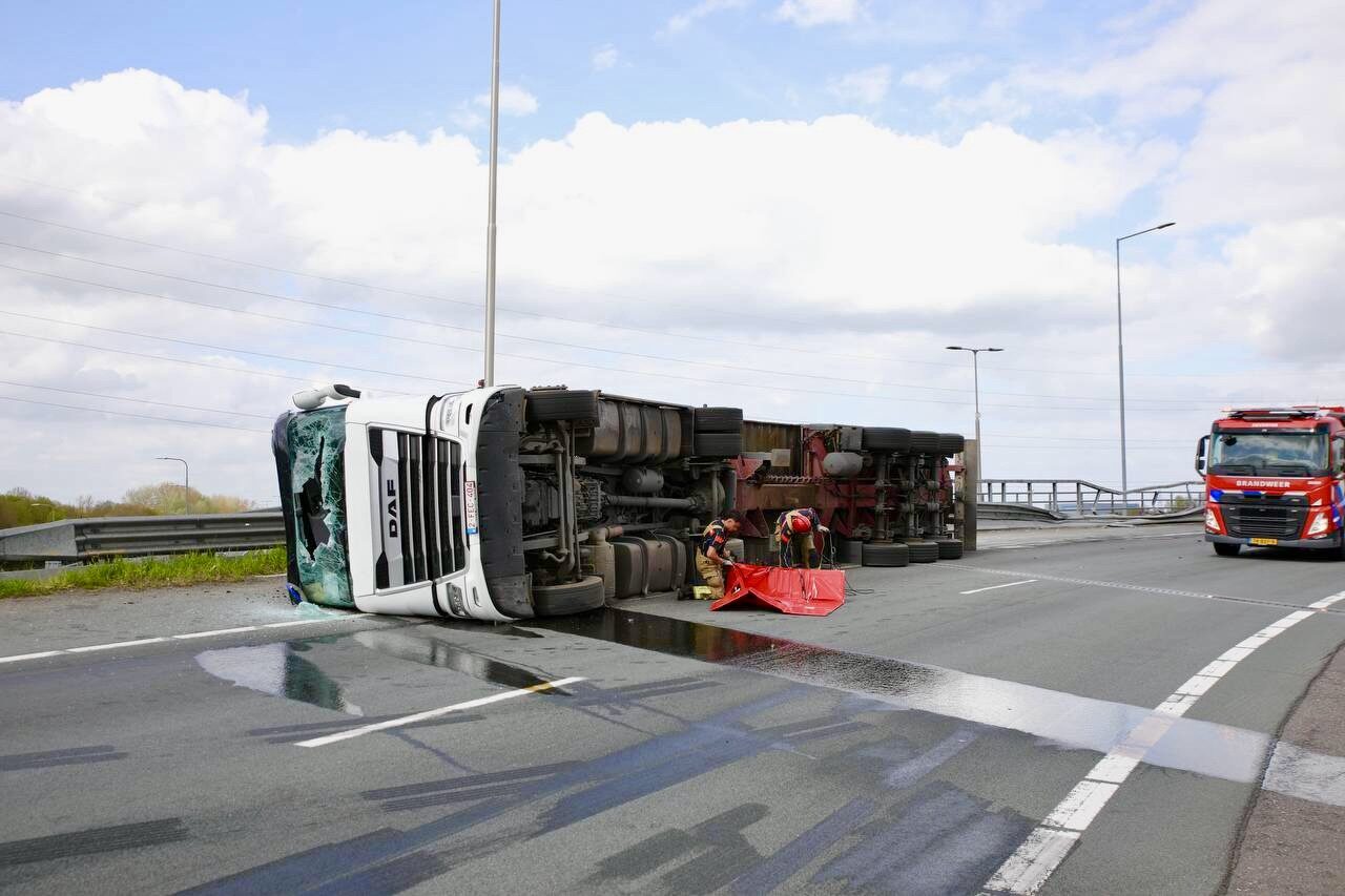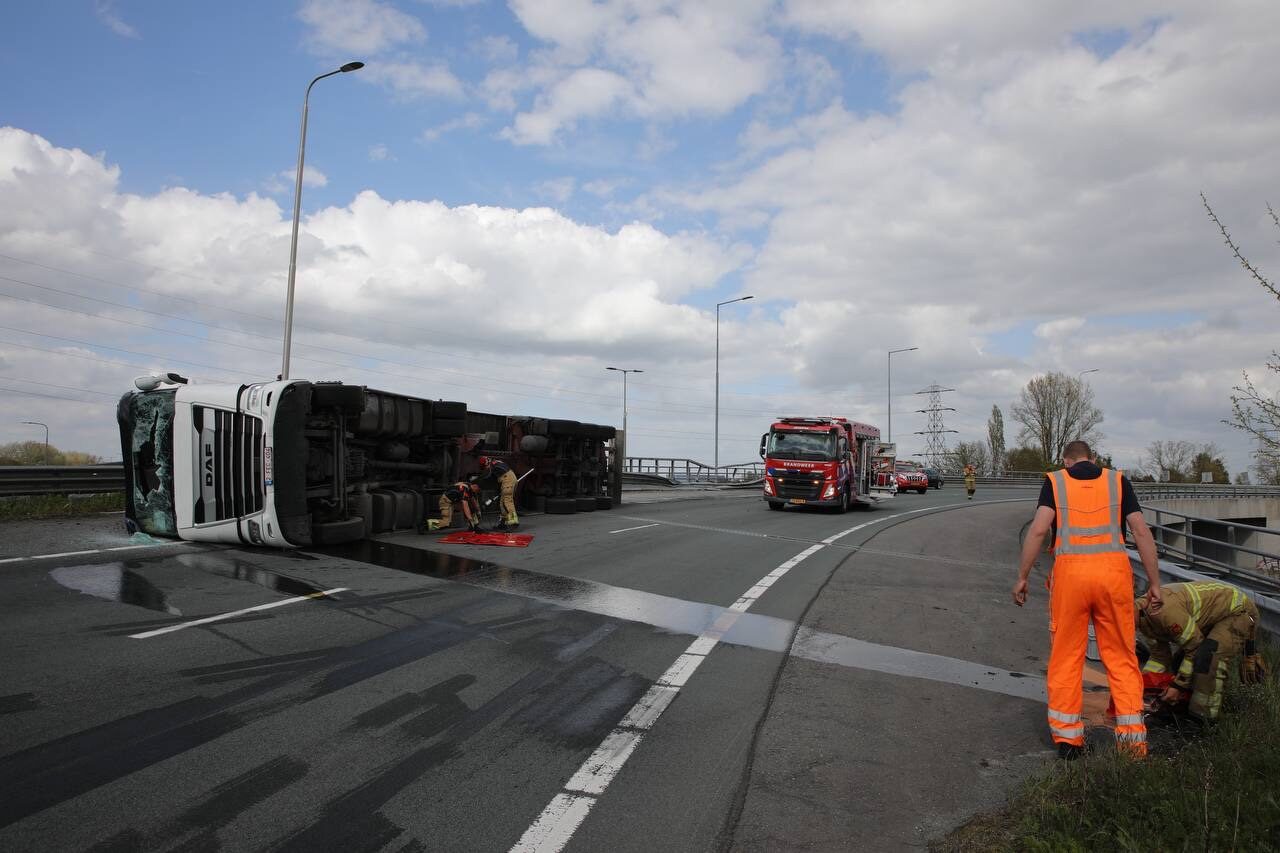 Vrachtwagen gekanteld op snelweg; brandweer met spoed ter plaatse