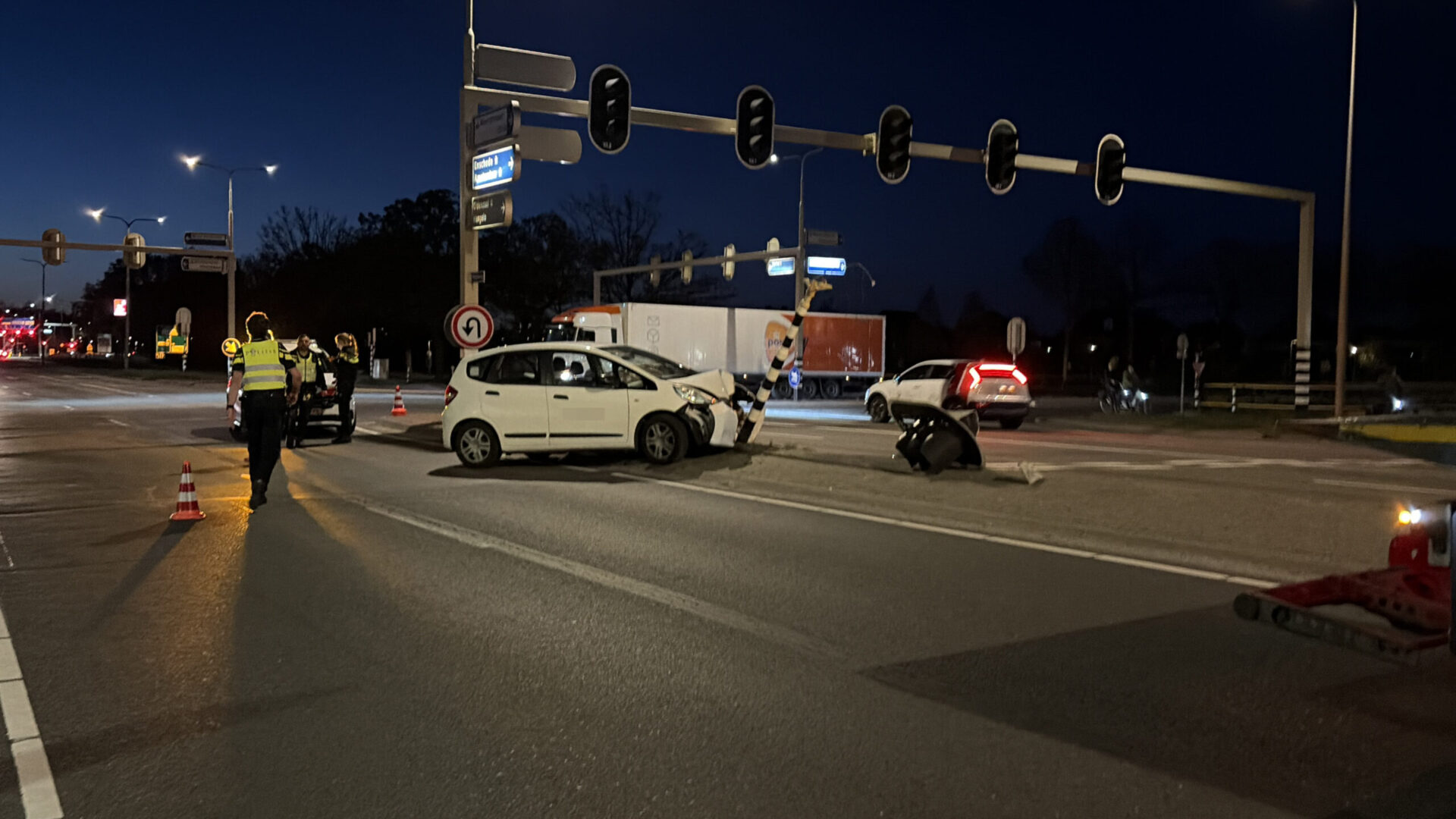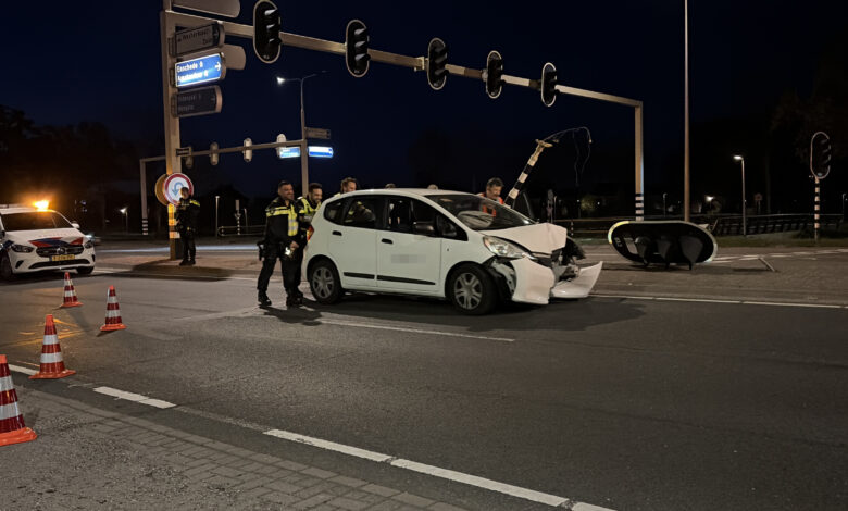 Een personenauto bleek tegen een verkeerslicht te zijn gereden. Door de klap zijn de verkeerslichten op de kruising uitgevallen, wat leidt tot een onveilige situatie voor verkeer van en naar de rondweg.