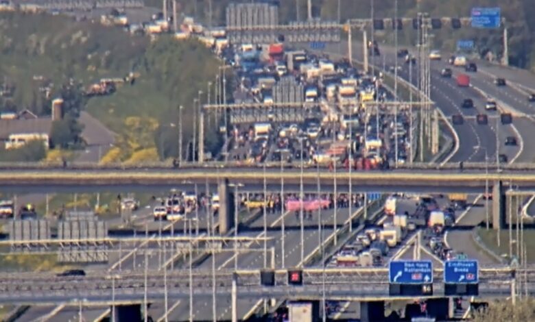 De A12 bij Utrecht is in beide richtingen afgesloten als gevolg van een actie van klimaatactivisten van Extinction Rebellion.