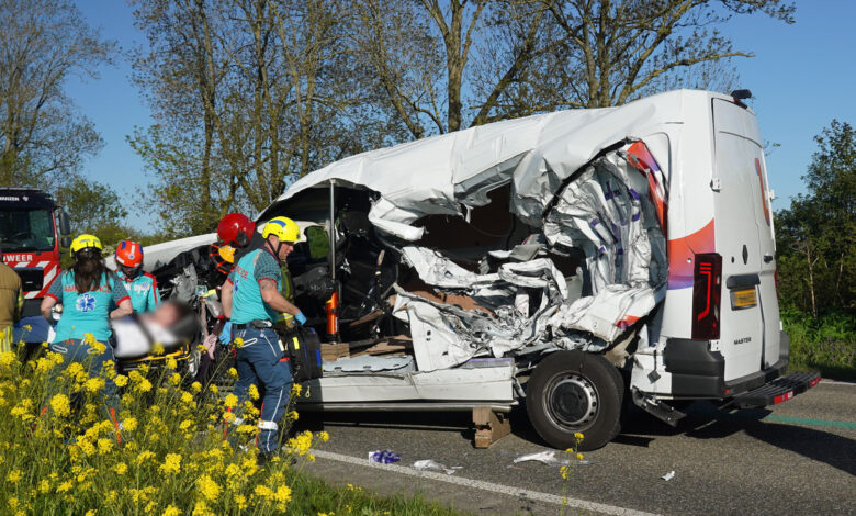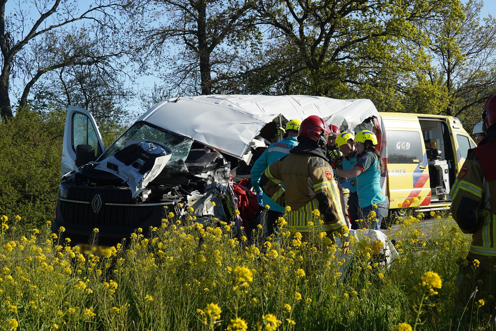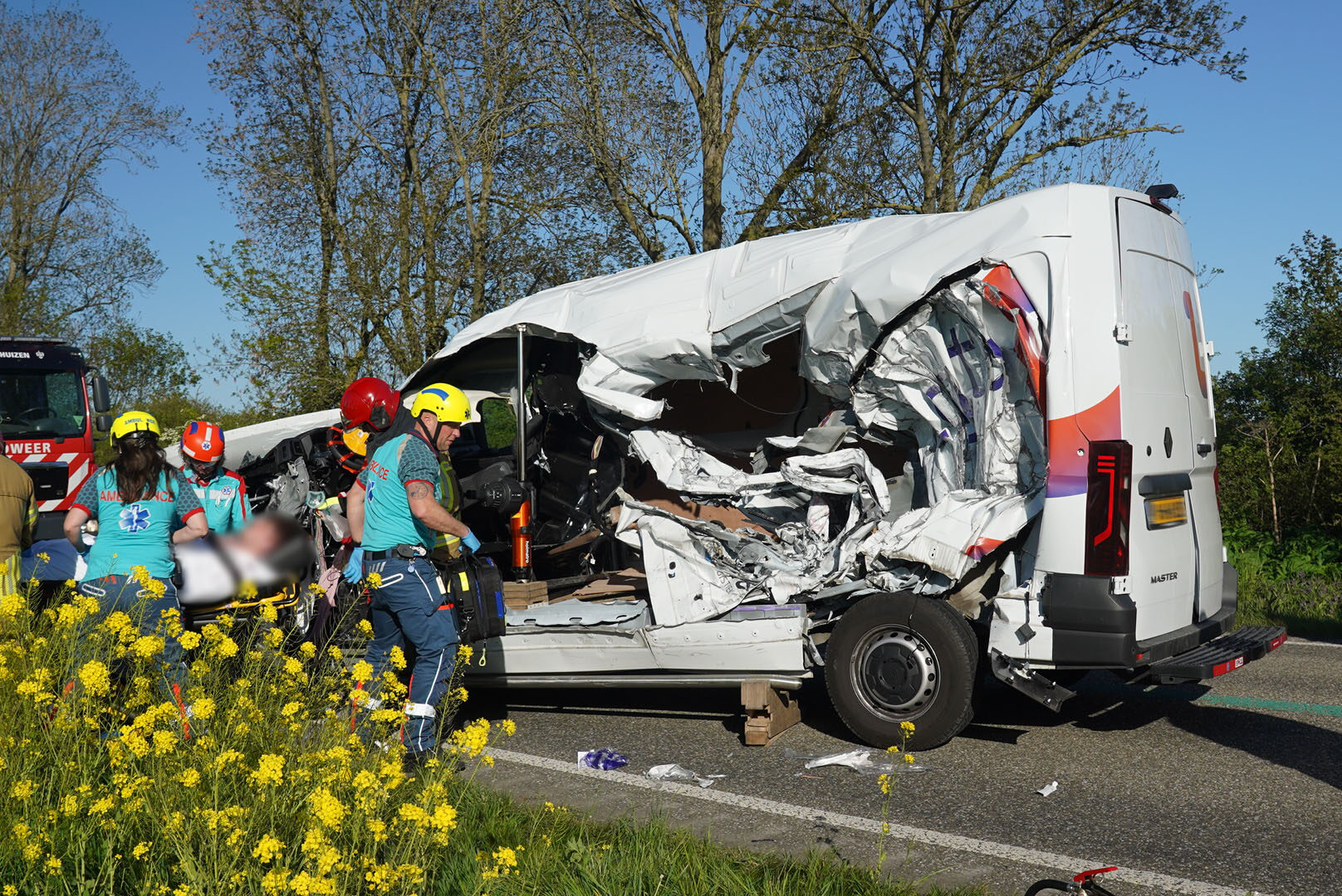 Ernstig ongeval tussen bestelbus en vrachtwagen; traumahelikopter opgeroepen