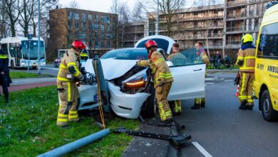 Grote ravage na eenzijdig ongeval; auto ramt verkeerslicht en slaat over de kop