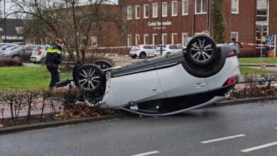 Auto over de kop in Veenendaal na botsing lantaarnpaal