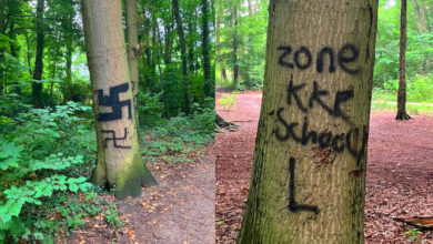 Bomen in bos achter Zone-College Twello beklad met hakenkruizen en grove teksten