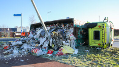 Vrachtwagen vol met puin kantelt op rotonde Epe