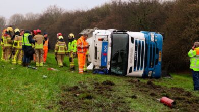 Vrachtwagen gekanteld op A1 Wilp, nog hele dag hinder