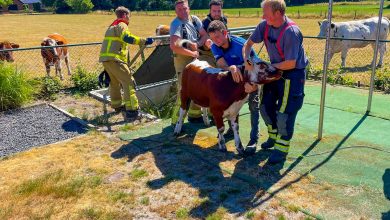 Ontsnapt kalf gaat op avontuur en zakt door trampoline