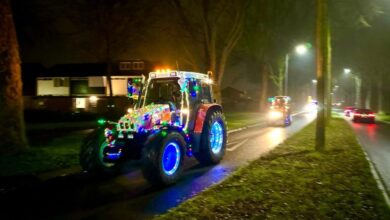 Tientallen verlichte trekkers brengen manden met appels en zuivel naar ouderen in Duiven