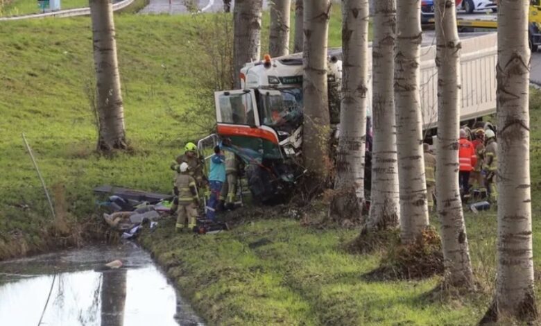 Zeer ernstig ongeval op snelweg, vrachtwagen botst frontaal tegen boom